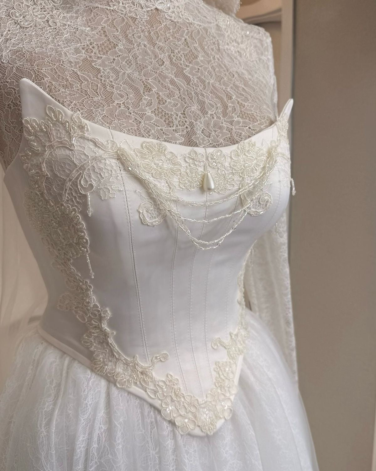 Corset top with lace appliqués and pearls beaded,bridal accessories corset bustier top