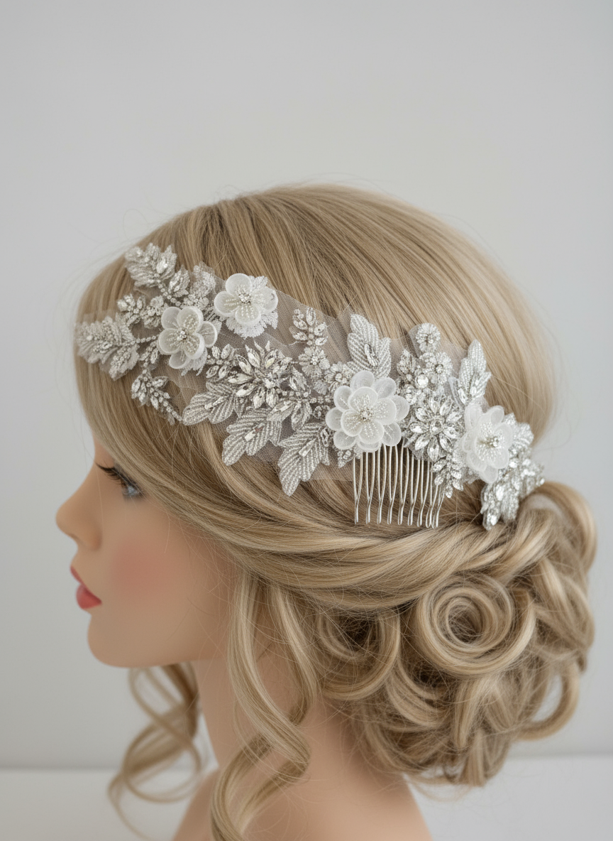 • Attached to bridal headpieces, tiaras, or combs for a graceful statement