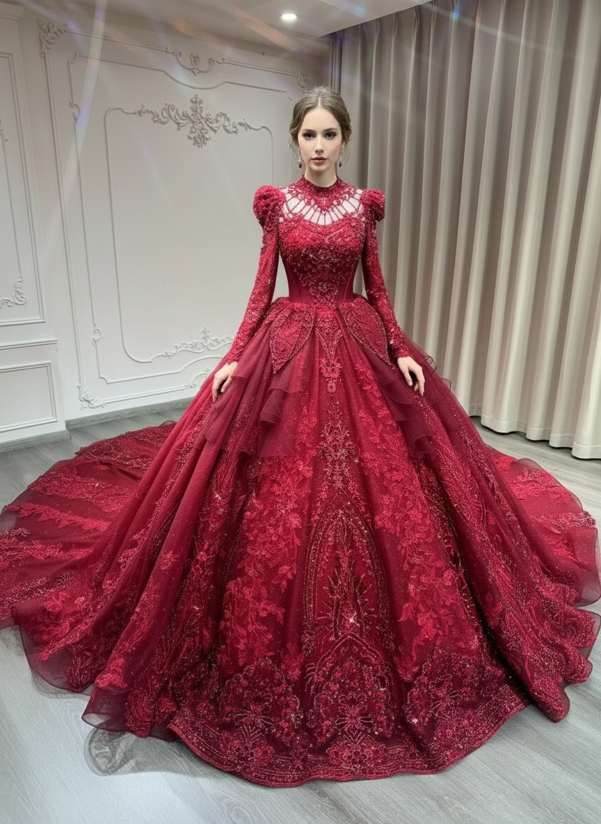 Gorgeous long sleeves dark red lace appliqués crystals rhinestones sequins beaded lace appliqués ball gown prom dress 2024