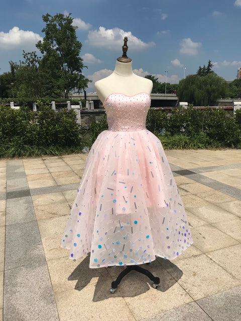 Sweetheart pink crystals sequins handmade beaded ball skirt tea length couture prom dress 2020